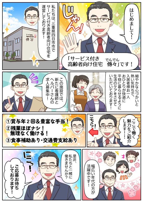 | 交通アクセス | 四日市あすなろう鉄道八王子線「西日野駅」より車で約3分 車通勤OK!バイク通勤OK! ※サービス付き高齢者向け住宅 傳々(でんでん)での勤務となります。 |